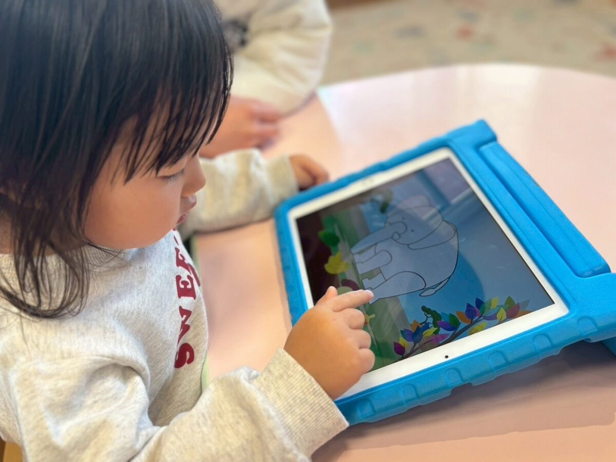 iPadに興味津々の子どもたち。動物にご飯を食べさせたり、自分で描いた雪だるまが画面に映し出されたりと